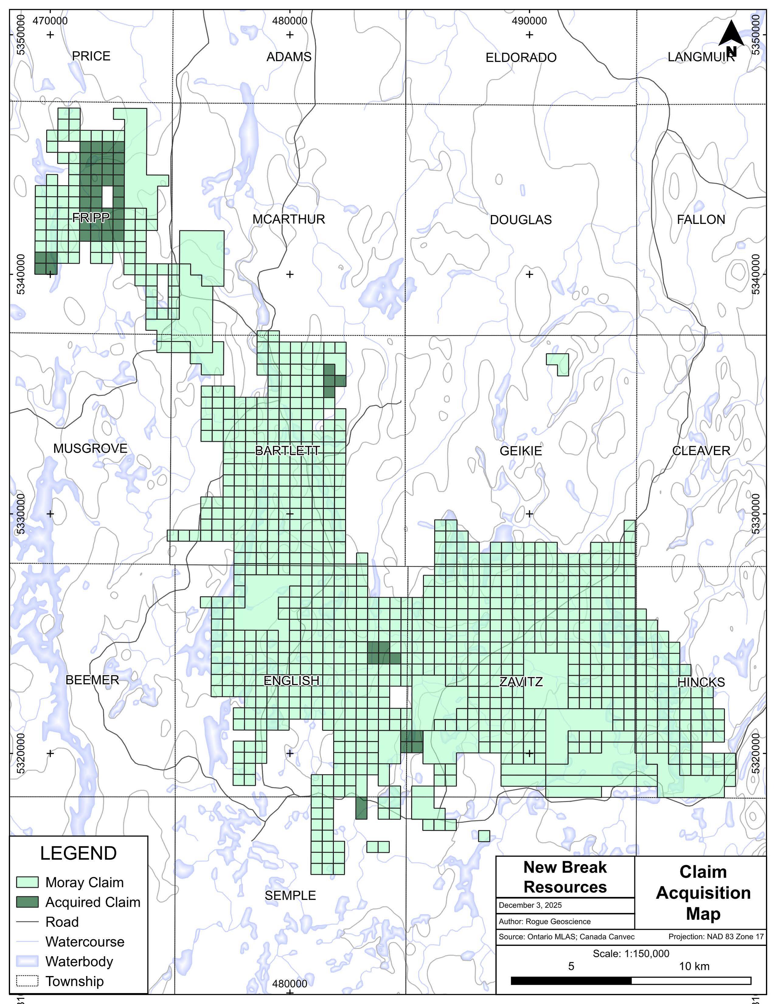 Toronto, Ontario, December 11, 2025 – New Break Resources Ltd. (CSE: NBRK) (“New Break” or the “Company”) is pleased to announce that it has entered into an agreement to acquire 13 single cell and one multi-cell mineral claims totaling approximately 324 hectares in Zavitz, English, Semple and Bartlett Townships, contiguous with its main Moray property (“Moray”) and an additional 38 single cell mineral claims totaling approximately 783 hectares in Fripp Township, that add to the Company’s existing property position to the northwest of Moray, as shown in dark green in the figure below (the “Acquired Claims”). Moray is located approximately 49 km southeast of Timmins, Ontario, where the Company’s summer 2025 maiden drilling program resulted in a new gold discovery.