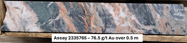 - 19.48 g/t Au over 2.5 metres from 80.5 to 83.0 metres.