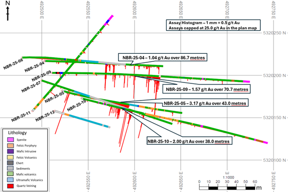 Drillhole NBR-25-09 was drilled to test for the gold zone between NBR-25-04 and NBR-25-05 and above the fault and ultramafic sequence referenced above, while Drillhole NBR-25-10 was drilled to test the mineralized zone above NBR-25-05.