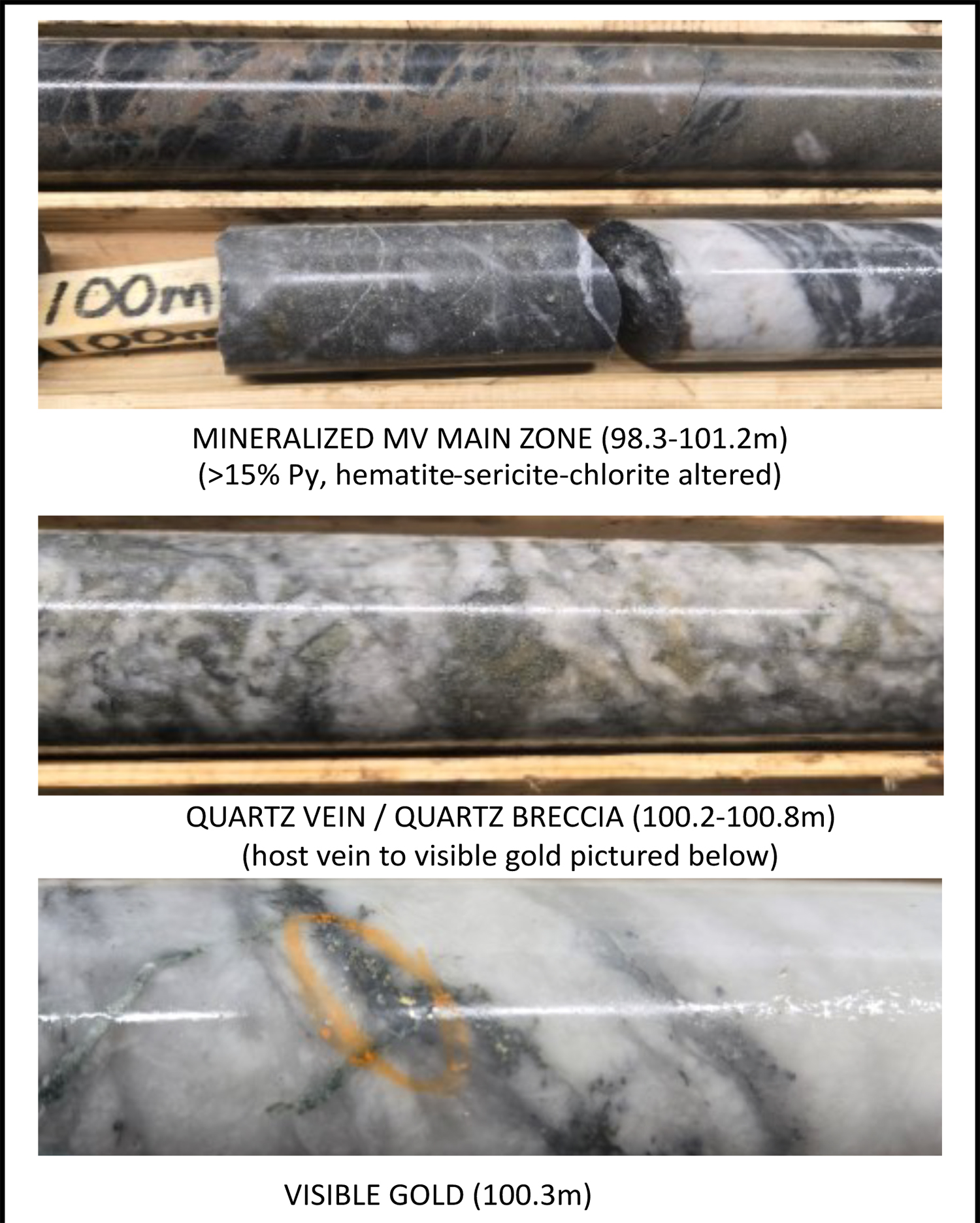 In late January 2026, New Break announced the resumption of Moray drilling, including mobilization by Enviro North Exploration Inc. and site preparation. The Company drilled two holes under its existing exploration permit, for a total of 569 metres in a high priority target area approximately three km to the southeast of the Zavitz zone. On February 17, 2026, following receipt of the new exploration permit, New Break commenced drilling back in the Zavitz discovery zone and has completed the first two drillholes of a planned 2,000 to 2,500 metres in this first phase of 2026 drilling. New Break is pleased to announce that it has encountered visible gold at 100.3 metres in drillhole NBR-26-04 (see Figure 1). While this is the first instance of visible gold in drilling on the Moray property, there is no guarantee that this will have a material positive impact on assay results. Assays are still expected to take a number of weeks, with this phase of drilling expected to last approximately until the end of March.