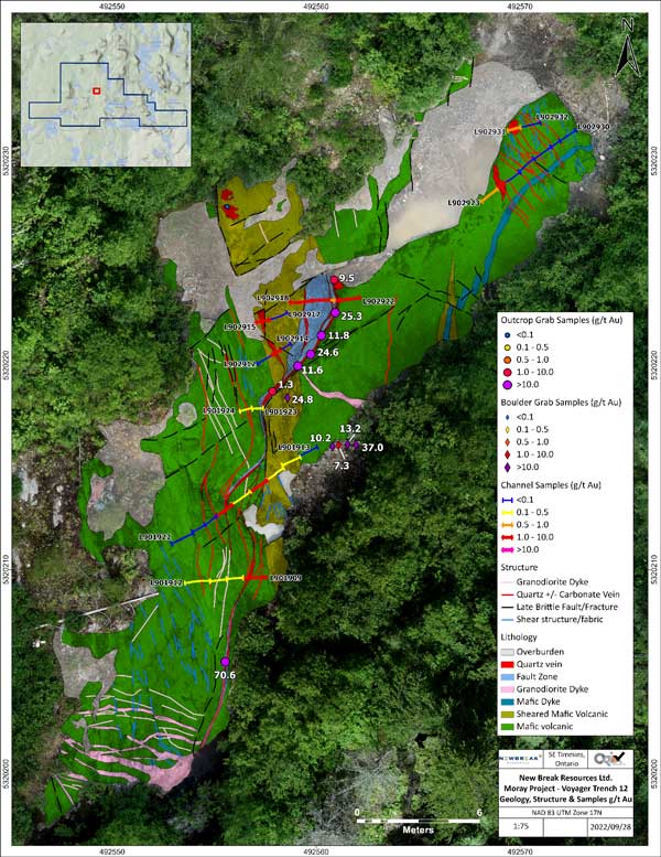 New Break engaged Orix Geoscience Inc. (“Orix”) to oversee the grab and channel sampling programs and complete detailed structural mapping of the Voyager and Fiset areas, which included taking 74 grab samples from various areas of the Moray property, including in and around the historical Trench 12, stripped by SGX Resources Ltd. (“SGX”) in 2012 at the Voyager showing (“Trench 12”). The highest-grade grab sample of 70.60 grams per tonne gold (“g/t Au”) was located at the south end of the main Trench 12. Five samples from New Break’s program yielded assays higher than the highest 21.8 g/t Au assay from the 2012 SGX prospecting and trenching program.